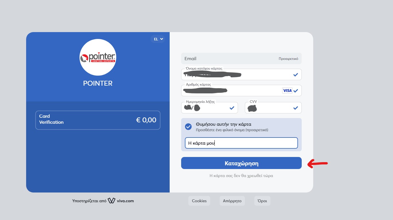 Στη συνέχεια συμπλήρωσε τα στοιχεία της κάρτας σου και κλίκαρε στην επιλογή "Θυμήσου αυτή την κάρτα". Δώσε ένα όνομα στην κάρτα σου και κάνε κλικ στην επιλογή "Καταχώρηση".
