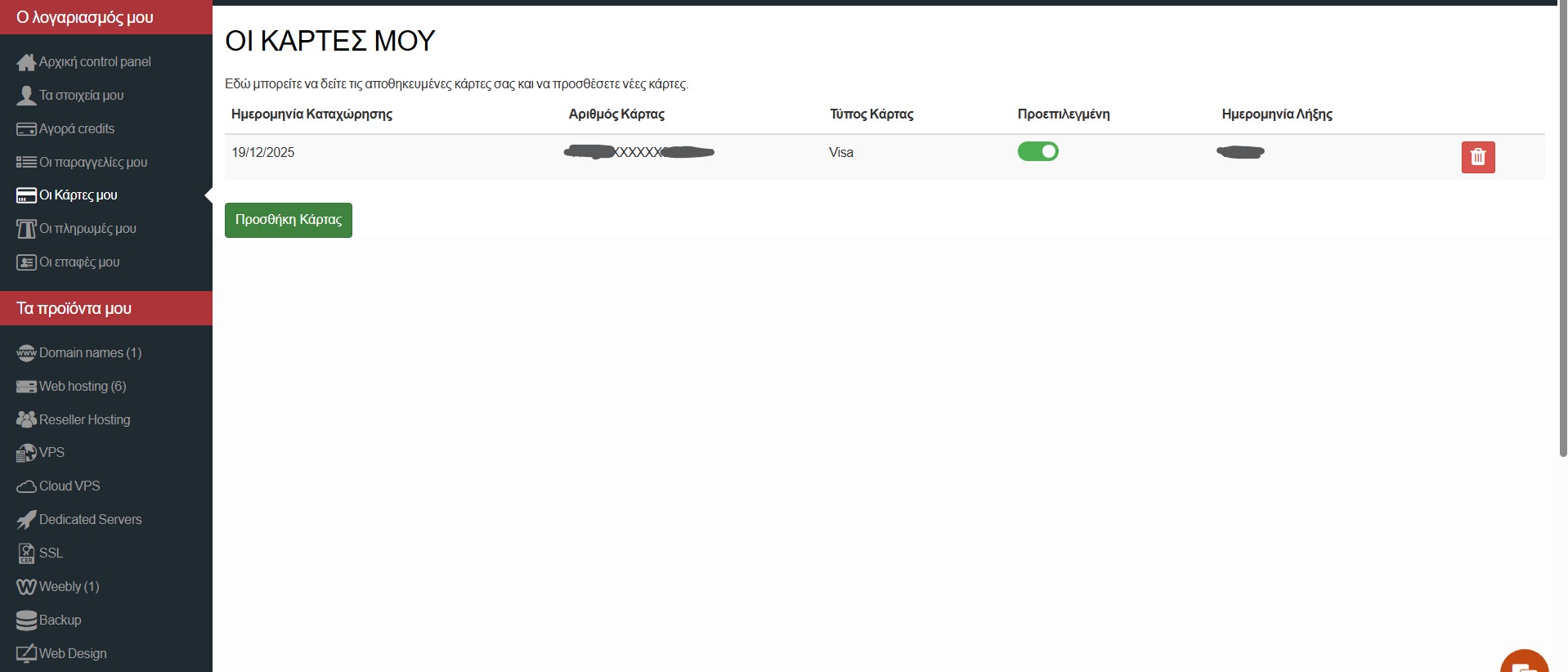 Αρχικά κάνεις σύνδεση στο control panel σου και στην αριστερή στήλη κάτω από την κατηγορία "Τα στοιχεία μου" βρίσκεις την επιλογή "Οι Κάρτες μου". Εδώ βρίσκονται όλες οι χρεωστικές ή πιστωτικές κάρτες που αποθηκεύεις και μπορείς να τις διαχειριστείς. Για να περάσεις μία νέα κάρτα, κάνεις κλικ στο "Προσθήκη Κάρτας".