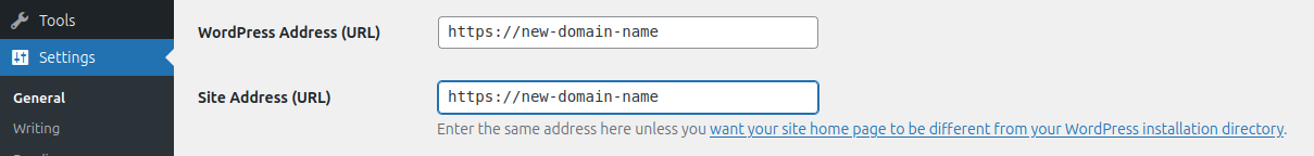 Μέσω του admin panel του WordPress έχεις τη δυνατότητα να αλλάξεις το URL του WordPress και του site σου. Μεταβαίνοντας μέσω του admin panel στις γενικές ρυθμίσεις (Settings → General), μπορείς να τροποποιήσεις την ονομασία του domain στις καρτέλες WordPress Address (URL) και Site Address (URL). Προσοχή στην τοποθέτηση URL, καθώς λανθασμένες ονομασίες μπορεί να οδηγήσουν σε errors στη σελίδα σου.