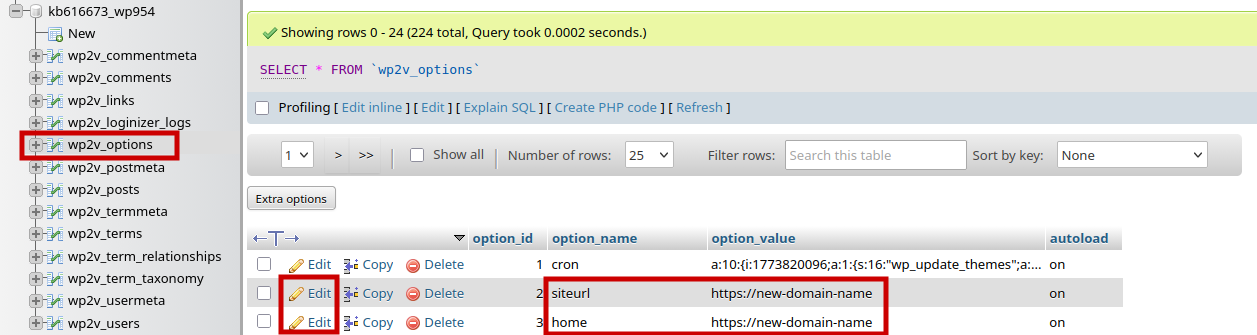 Σε περίπτωση που δεν μπορεί να υπάρξει πρόσβαση στο admin panel του WordPress ή στα αρχεία του domain μέσω FTP, μπορείς να αλλάξεις το domain name απευθείας μέσω των ρυθμίσεων της βάσης δεδομένων στο phpMyAdmin. Ειδικότερα, μεταβαίνοντας στο phpMyAdmin, επιλέγεις από τη βάση σου τον πίνακα wp_options και τροποποιείς (Edit) τα Values των σειρών siteurl και home ώστε να δείχνουν στη νέα σου ονομασία.