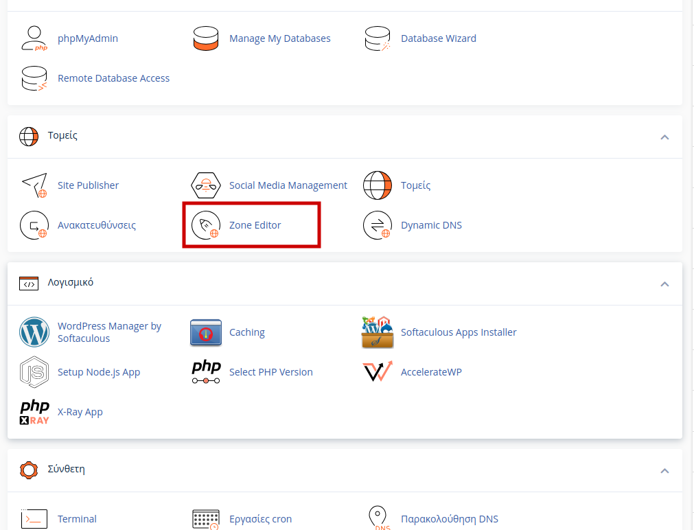 Αρχικά θα συνδεθείς στο cPanel και θα επιλέξεις στην κατηγορία Domains(Τομείς) το Zone Editor.