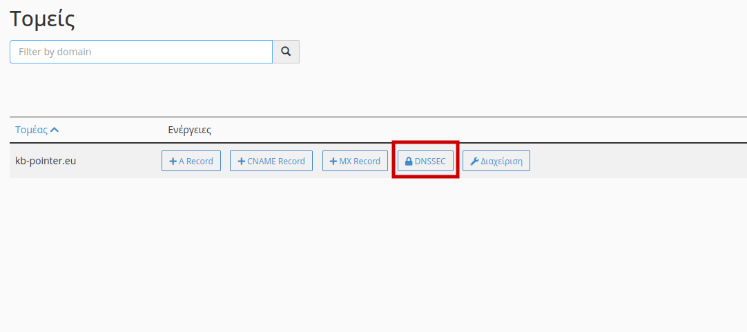 Αφού επιλέξεις το Domain Name σου, κάνεις κλικ στην επιλογή DNSSEC.