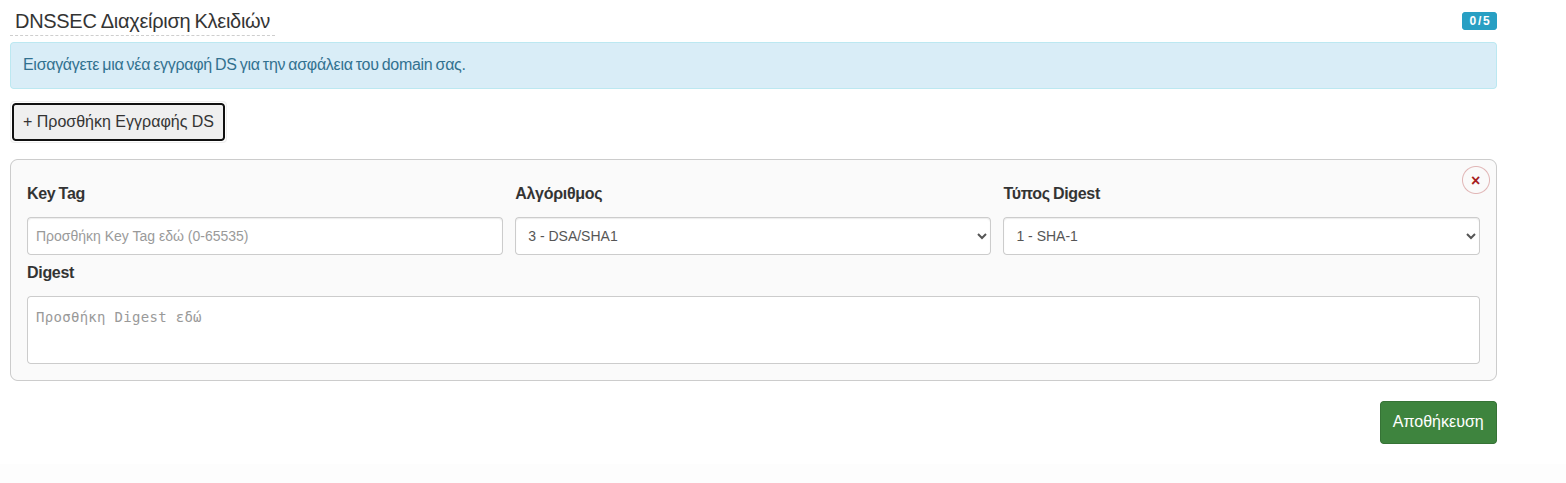 Στην καρτέλα “DNSSEC Διαχείριση Κλειδιών” επιλέγεις Προσθήκη Εγγραφής DS και συμπληρώνεις όλες τις πληροφορίες των κλειδιών που είχαν δημιουργηθεί αντίστοιχα στο cPanel σου, ειδικότερα Key Tag, Αλγόριθμος, Τύπος Digest και το Digest.