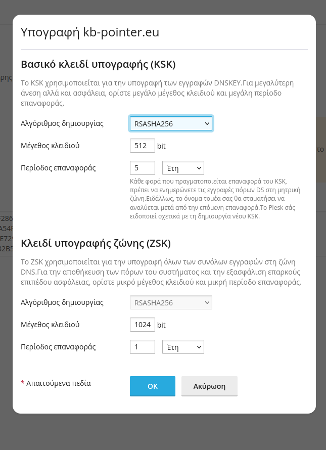 Στο παράθυρο που εμφανίζεται έχεις τη δυνατότητα να προσαρμόσεις τα χαρακτηριστικά των κλειδιών KSK (Key Signing Key) και ZSK (Zone Signing Key):